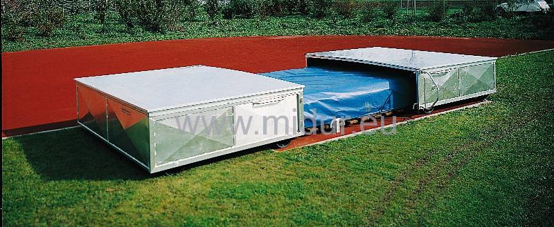 Určení pro skok do výšky, skoku o tyči. Plně svařovaná hliníková konstrukce, základní rám s bočními plochami hliníkových kazet se 4 pevnými koly. Vodě odolná konstrukce střechy z hliníkových profilů . Zvláště velké plastové kola umožňují snadný pohyb zařízení. Kryty jsou plně uzavřené a dodávány ve dvou částech. Kola jsou umístěny lícem dolů. Obě poloviny jsou pevně slisovány s upínacími páky. Kryty jsou uzamykatelné. Dodávka bez zámku. Odpuzuje vodu (není vodotěsný) verze! Podložka by proto měla být vybavena pláštěnkou přes kryt! K montáži 2-3 asistenti. Cena za 1m².