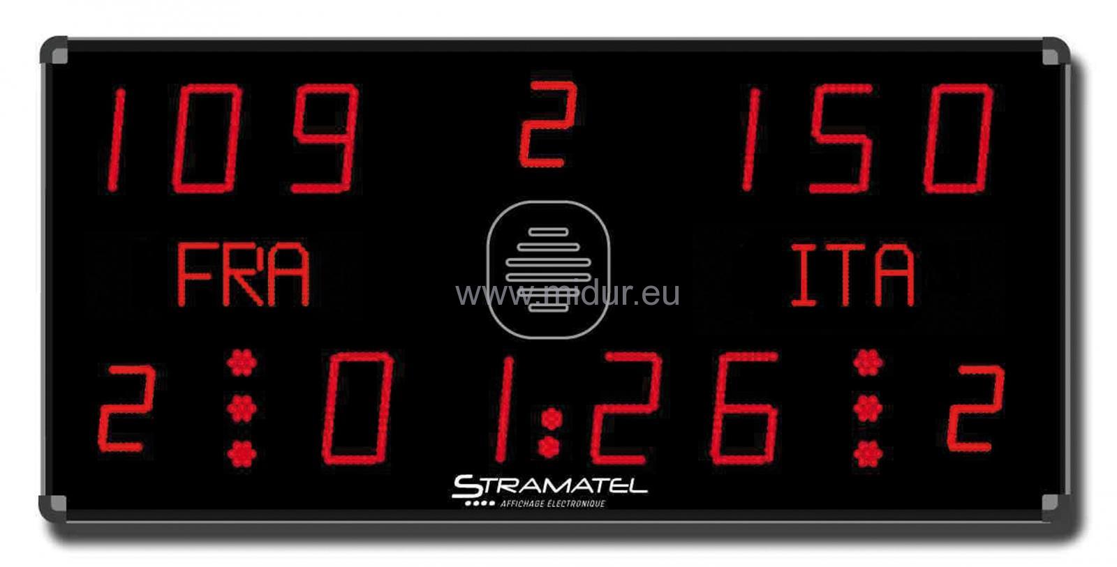 - Zobrazí skóre (od 0 do199), období, hra období, oddechové časy, týmové fauly a sankční chronometr za tým (1-místný, házená) + jména týmu